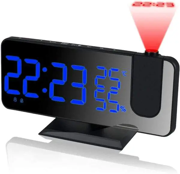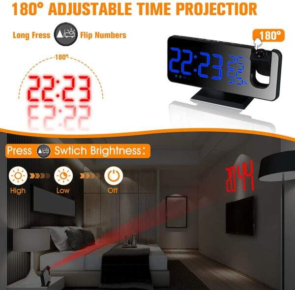 - Projecteur à temps réglable à 180° : la projection est ultra-claire au mur ou au plafond. La luminosité et l’angle réglables facilitent la lecture lorsque vous êtes allongé dans le lit la nuit. Vous pouvez ajuster la taille du nombre en ajustant la distance. Distance de projection optimale : 1,6 à 9,8 ft (0,5 à 3 M)