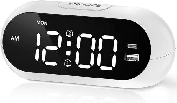 - 【Ports de chargement USB A et USB C pratiques】 – Contrairement à d’autres horloges, cette horloge de chevet dispose de 2 ports USB placés à l’avant afin qu’elle puisse charger divers appareils électroniques, tels que l’iphone, l’ipad, les airpods, l’iphone 12. Pendant que vous dormez, vous ne Pas besoin de chercher une autre prise, vous pouvez profiter de la commodité de la recharge via le réveil de votre lit.