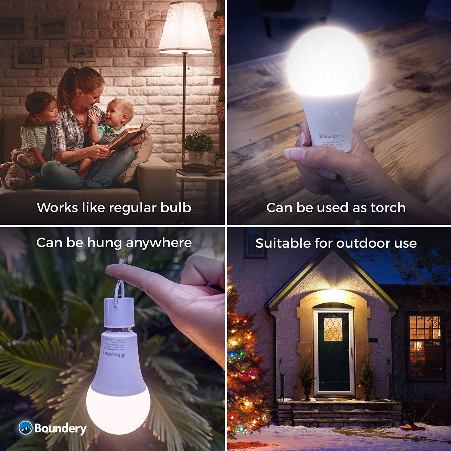 - AMPOULES D’URGENCE POUR PANNE DE COURANT – L’ampoule d’éclairage de secours à recharge automatique Boundery EBULB s’allume automatiquement en cas de panne de courant. Utilisez-le comme une lampe de poche à main pratique ou comme un guide lumineux de 24 heures qui est toujours chargé. L’installation ne prend que quelques secondes et la batterie se charge lorsqu’elle est branchée. Obtenez l’ampoule d’éclairage de secours à recharge automatique la plus vendue au monde.