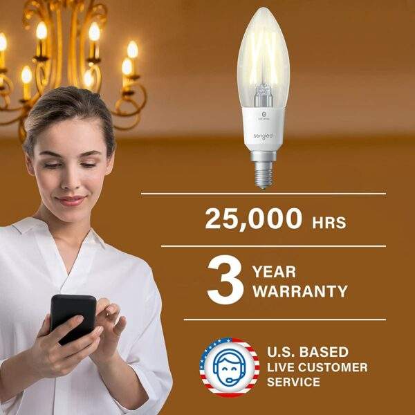 - Créez facilement un éclairage confortable – L’ampoule intelligente candélabre Sengled convient à la plupart des scènes d’intérieur. 2700K Soft White peut créer un éclairage avancé et confortable, ajoutez de l’éclat à vos lustres, appliques et autres luminaires décoratifs avec ces ampoules Alexa qui imitent l’incandescence.