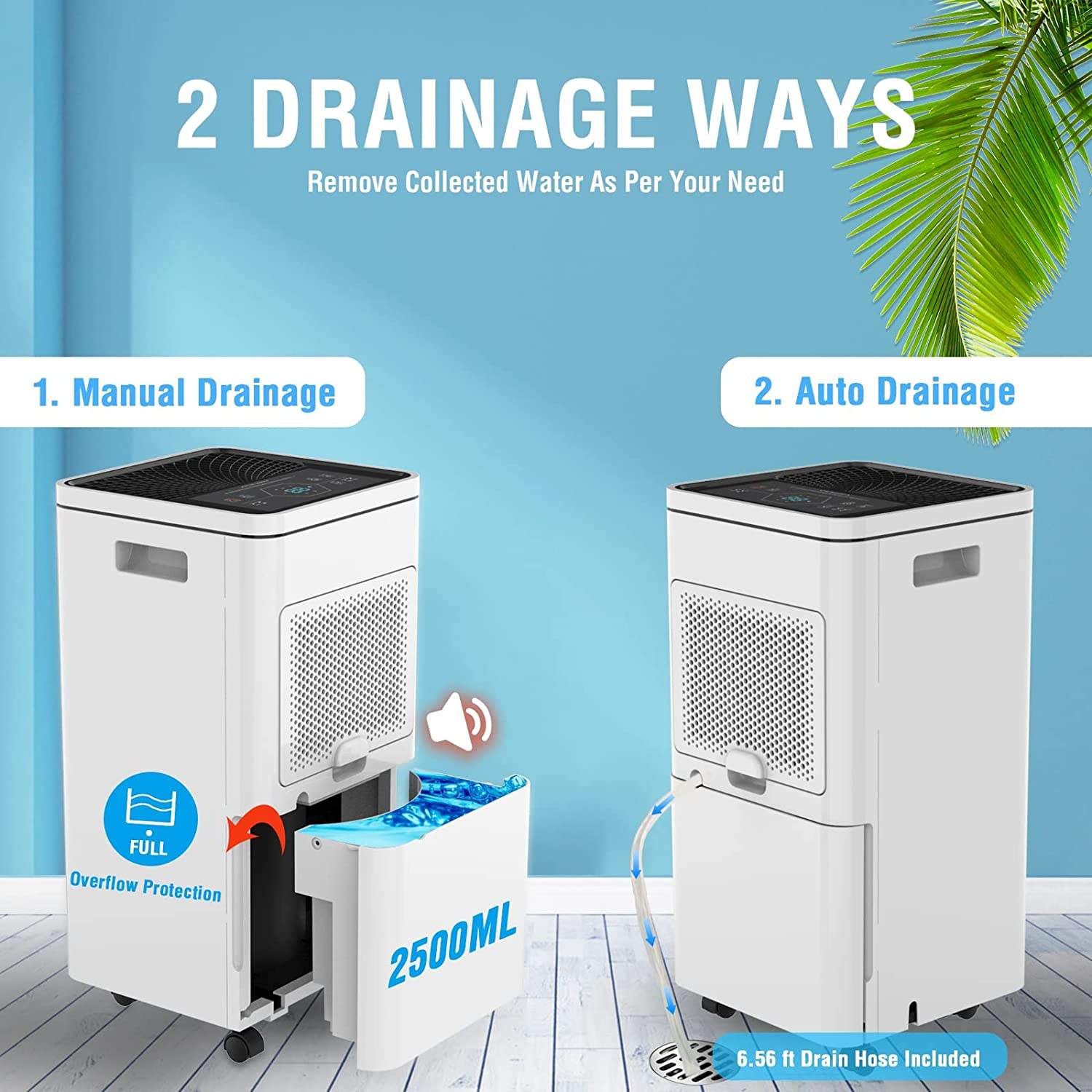 - 💦 [Facile à utiliser avec un tuyau de vidange gratuit] Pas besoin d’acheter un tuyau d’arrosage, le déshumidificateur COLAZE avec tuyau de vidange (6,5 pi de long) peut se vidanger automatiquement en continu par gravité. Ou, il s’éteindra automatiquement lorsque le réservoir d’eau (0,66 gallon/2,5 L) est plein pour éviter tout débordement. Ce déshumidificateur avec une minuterie de 24 heures à prérégler pour allumer/éteindre l’unité et une fonction de dégivrage automatique : il peut détecter le besoin de dégivrage et traiter le dégivrage automatiquement.