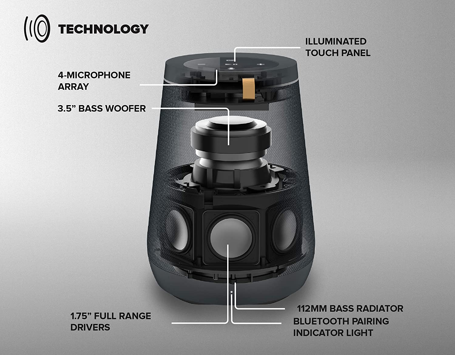 - 7 CANAUX ET SON 360º : L’enceinte Space est conçue avec 7 haut-parleurs large bande de 1,75″ et un subwoofer de 3,75″ et un radiateur de basses. Les haut-parleurs large bande sont placés dans un réseau circulaire combiné à un amplificateur spécial qui alimente les haut-parleurs en un son à 360º, suffisamment puissant pour remplir la pièce. Space peut également se connecter au Wi-Fi. Avec la prise en charge Bluetooth, vous pouvez connecter presque n’importe quel appareil à votre enceinte.