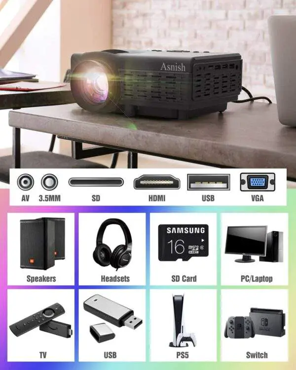 - 【Qualité et service fiable】 Nous fournissons une garantie d’un an pour le mini projecteur Asnish. Si vous avez un problème, veuillez contacter notre service clientèle dans le manuel pour une solution rapide.(Nous recommandons de l’utiliser dans des conditions de faible luminosité pour obtenir de meilleurs résultats.Le Bluetooth ne se connecte pas aux smartphones, mais uniquement aux casques et aux enceintes.)